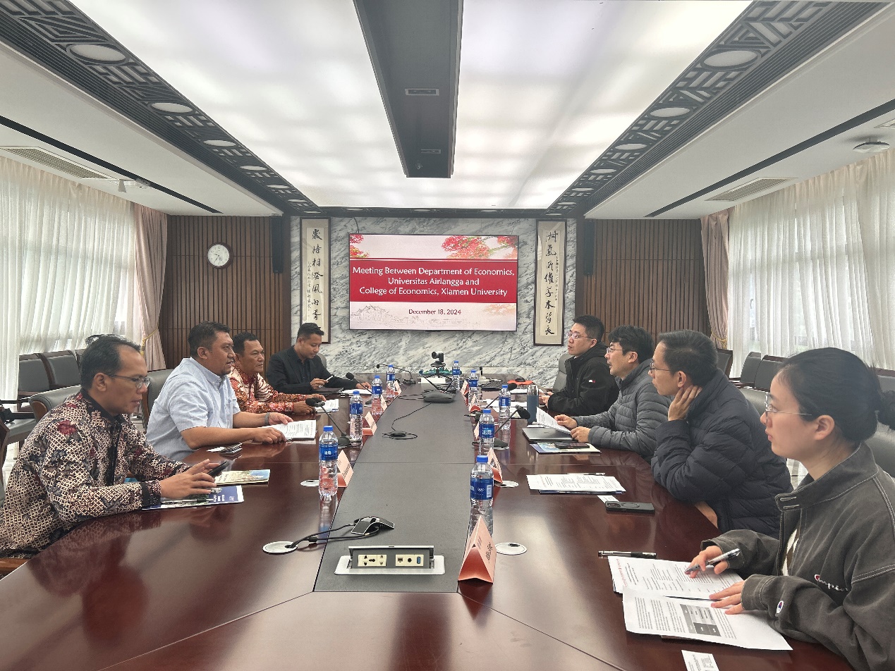 12月18日,印度尼西亚艾尔朗加大学经济与商学部经济系(Department of Economics, Faculty of Economics and Business, Universitas Airlangga)系主任Rossanto Dwi Handoyo教授、Deni Kusumawardani博士、Tri Haryanto博士和Wahyu Wisnu Wardana老师一行到访经济学科,经济学院财政系副主任李智副教授、陈煌助理教授和许梦涵副教授等与来宾会面,双方进行了友好座谈交流。