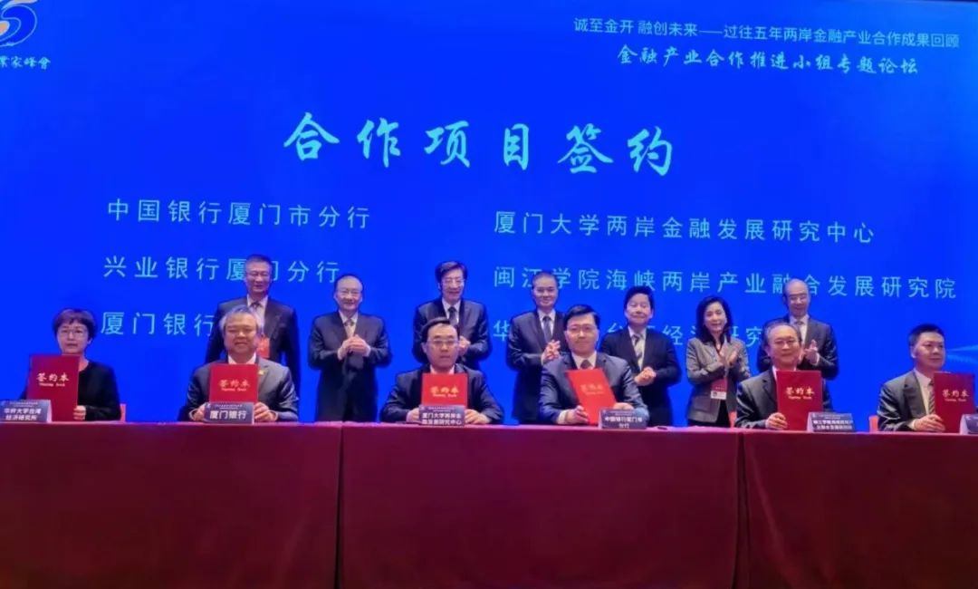 峰会年会期间,金融产业合作推进小组召开专题论坛,论坛上,中国银行厦门市分行与厦门大学两岸金融发展研究中心签订合作协议,厦门大学经济学院、王亚南经济研究院院长周颖刚教授代表厦门大学两岸金融发展研究中心上台签约。峰会大陆方面理事长郭金龙,峰会大陆方面金融组召集人李礼辉,峰会台湾方面金融组召集人魏启林等见证签约仪式。