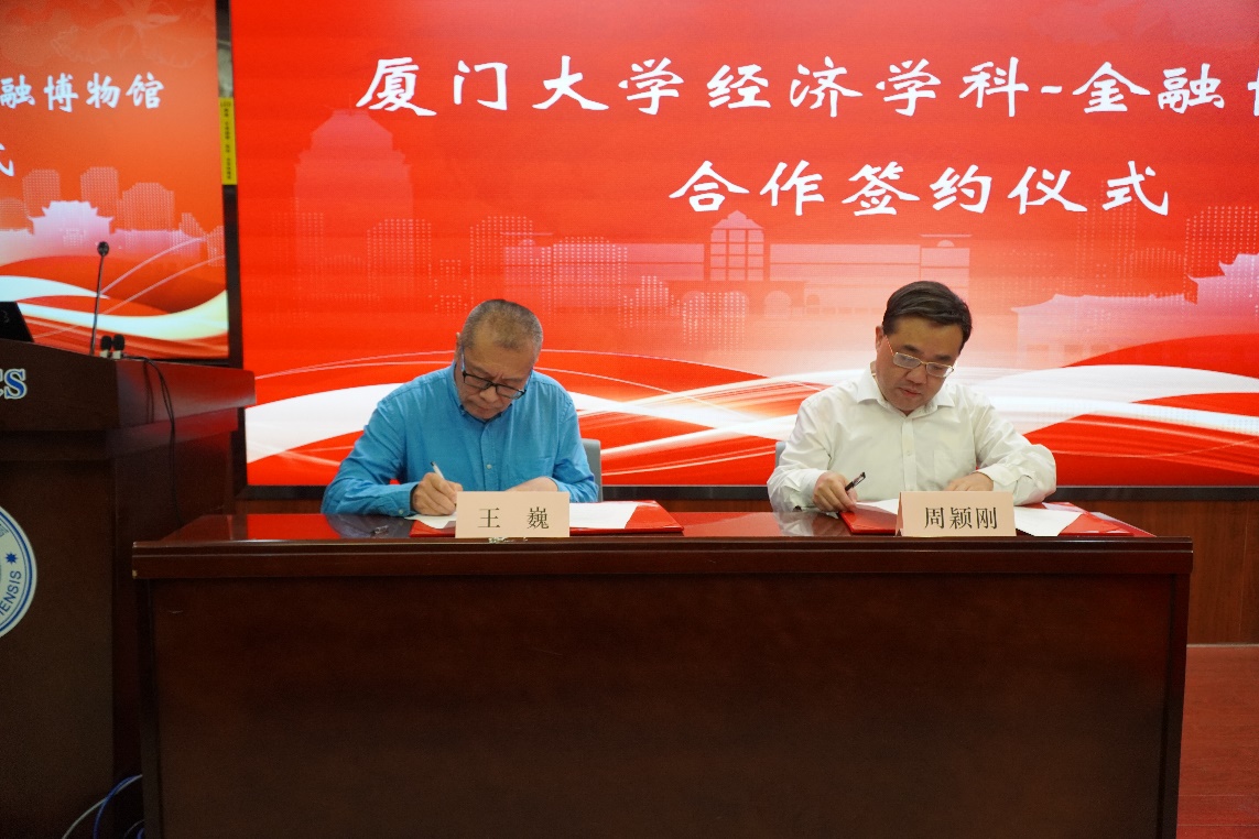 厦门大学经济学院、王亚南经济研究院院长周颖刚教授与王巍理事长就合作共建井冈山红色金融培训中心、智能并购与数字金融实验室、厦门大学经济学院课程思政与实践教学中心签约。