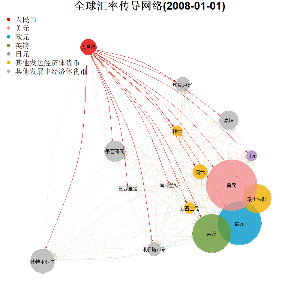 由于篇幅有限以及图片显示等考虑,仅在正文展示16个具有代表性的经济体货币的传导网络,若读者有兴趣可联系作者索取完整的世界主要货币汇率传导网络图。