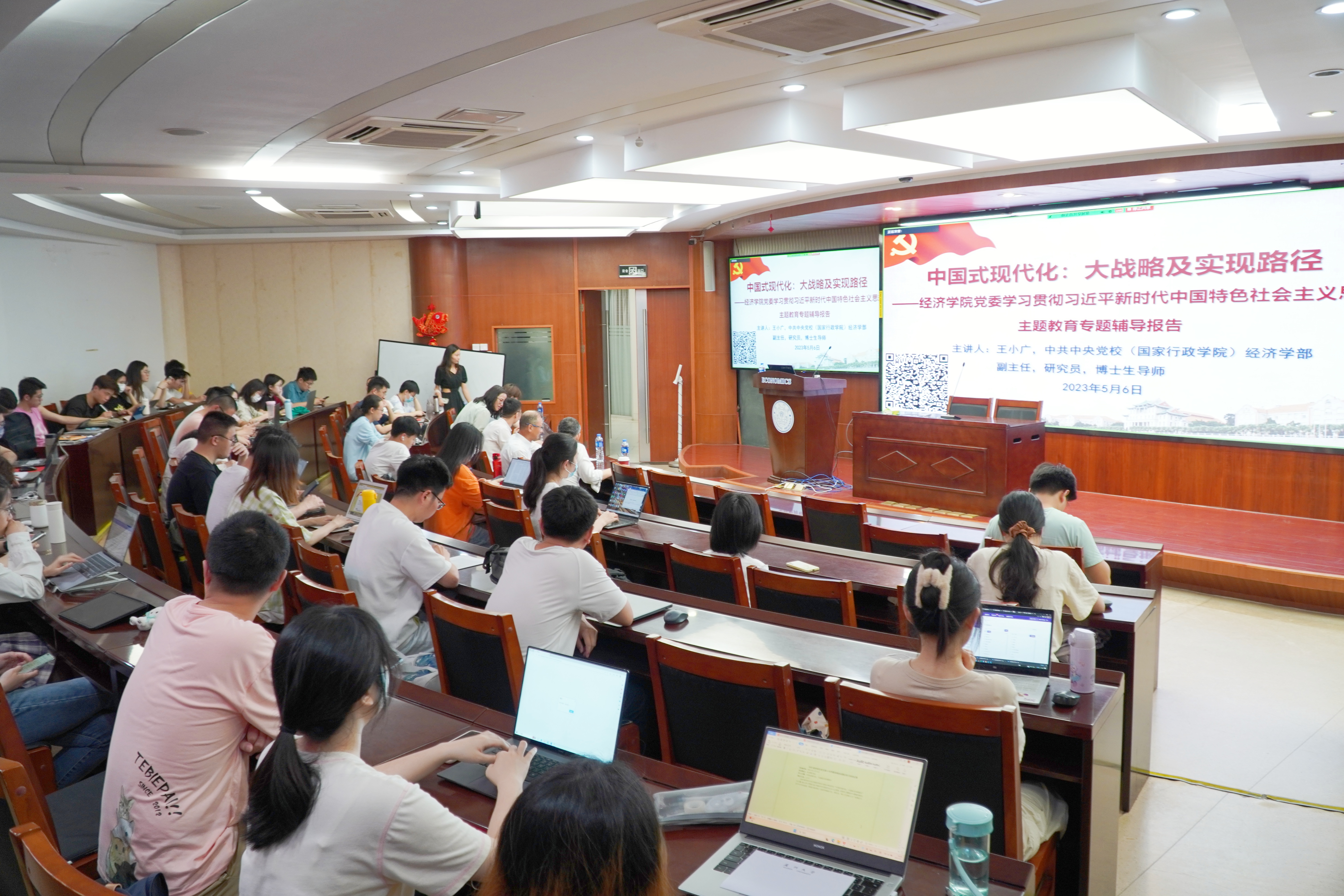 为推动学习贯彻习近平总书记在学习贯彻习近平新时代中国特色社会主义思想主题教育走深走实,5月6日下午,经济学院党委邀请中共中央党校(国家行政学院)经济学部副主任王小广研究员作专题辅导报告。学院党委副书记杜海林主持并讲话。