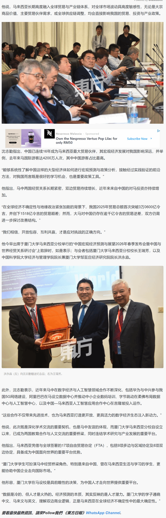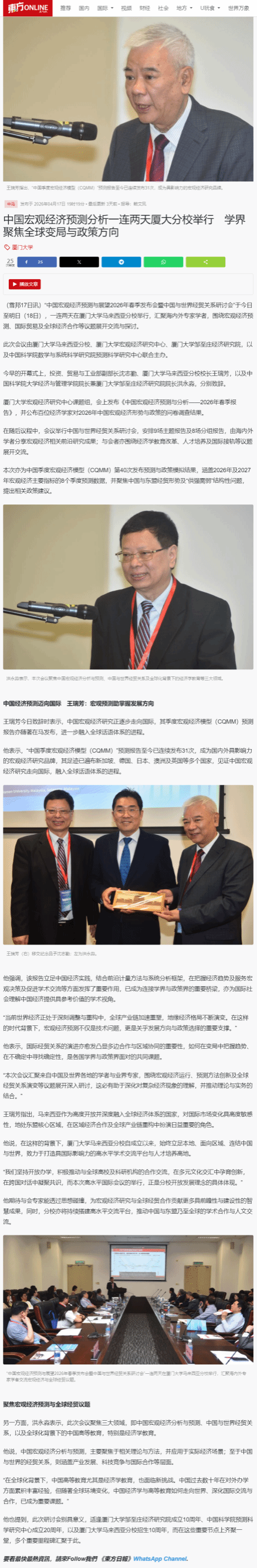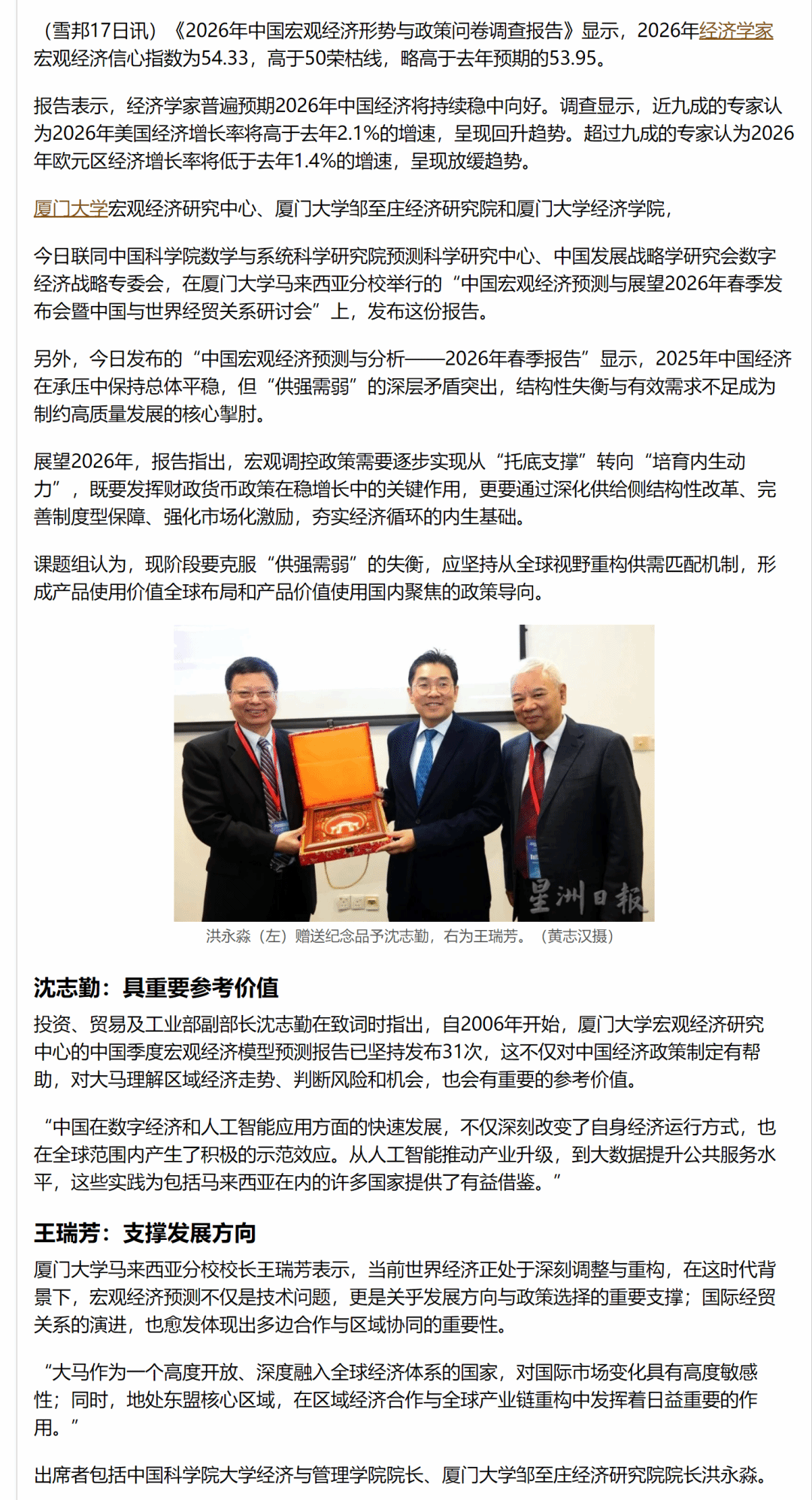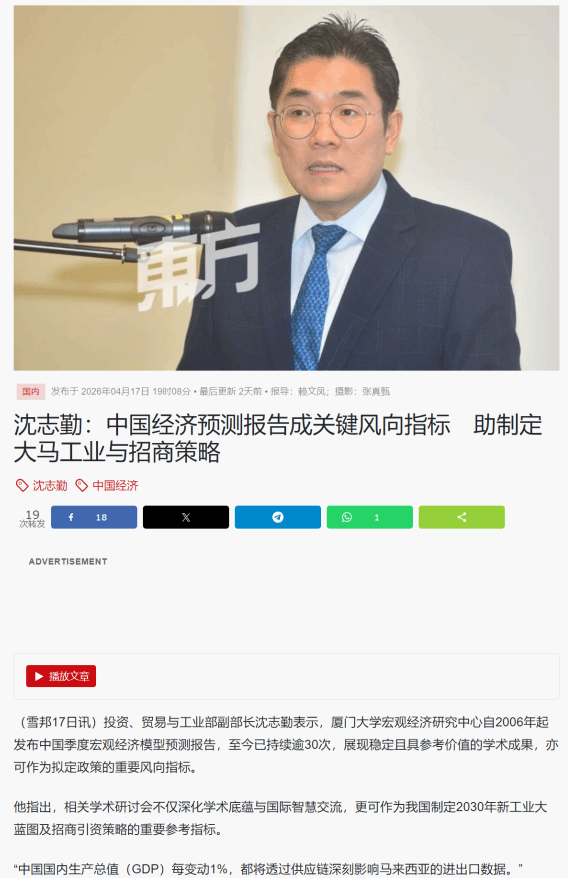会上发布了基于厦门大学中国季度宏观经济模型(CQMM)的研究成果《中国宏观经济预测与分析——2026年春季报告》及百位经济学家“2026年中国宏观经济形势与政策问卷调查(上半年)”的结果,引发国内外权威媒体广泛关注,来自新华社、中新社、The Star(《星报》)、星洲日报、Oriental Daily(《东方日报》)、China Press等多家媒体参与会议现场采访,并在会后进行报道,相关新闻也受到新浪财经、搜狐新闻等国内媒体转载。