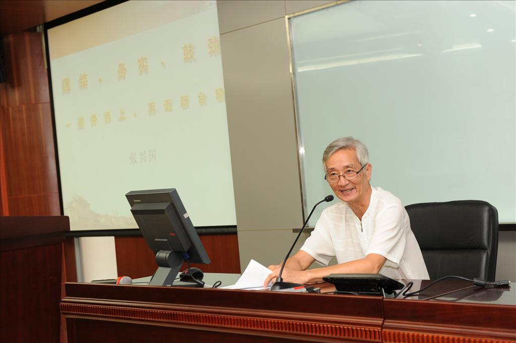 接着,经济学院顾问委员会秘书长、原党委书记张兴国作了题为《团结、务实、鼓劲——趁势而上,再迈新台阶》的报告。张兴国结合自身的经历经验,将此次报告分为“要有历史的记忆”、“要有衡量的标准”和“要树立一种意识”三个部分。在“要有历史的记忆”部分,张兴国说,大到国家、民族,小到单位、个人,都要具有历史的记忆,随后他从经济学院、WISE的发展历史,软硬环境的今昔对比,包括学科排名、学生教育竞争力在内的各项指标在全国的地位,以及近几年来经济学科取得的成绩进行阐述,他表示这些成绩应归功于校党委和校行政的正确领导、归功于团结与改革,学院党政领导班子的精诚团结、两院全体师生的共同努力以及行政技术团队的执行力。在“要有衡量的标准”部分,张兴国指出,成功与否主要依据群众认同感,特别是对事业发展的认同感,绝大部分师生支持、拥护经济学科近年来的改革。在“要树立一种意识”部分,张兴国表示,民生就是天心,经济学科的民生就是经济学科的全面发展,行政技术团队的服务让师生满意就是最大的民生;与民生一脉相承的是,办事要按程序、规章制度,公开透明进行。此外,张兴国还以自身经历分享秘书的职责和秘书能力的培养等。张兴国最后表示,目前是经济学科发展的最宝贵、最难得的机遇,天时地利人和皆备,希望全体师生员工肩负起时代赋予的神圣而光荣的使命。