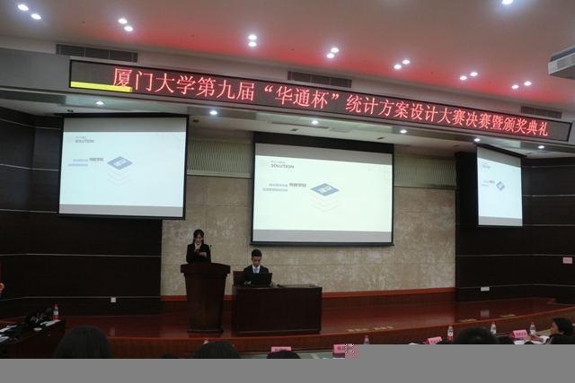 24日晚,厦门大学第九届“华通杯”统计方案设计大赛决赛暨颁奖典礼在经济楼N402正式拉开序幕。本次大赛由厦门大学教务处、校团委、经济学院主办,并由福建华通工商资讯有限公司、北京奥维营销咨询有限责任公司、经济学院团委、经济学院统计系联合承办。厦门大学经济学院统计系教授罗乐勤,副教授陈泽聪,助理教授徐明生、张玉哲、许永洪以及两位赞助商代表作为评委出席大赛。来自全校各单位的十支优秀队伍在这里一决高下。