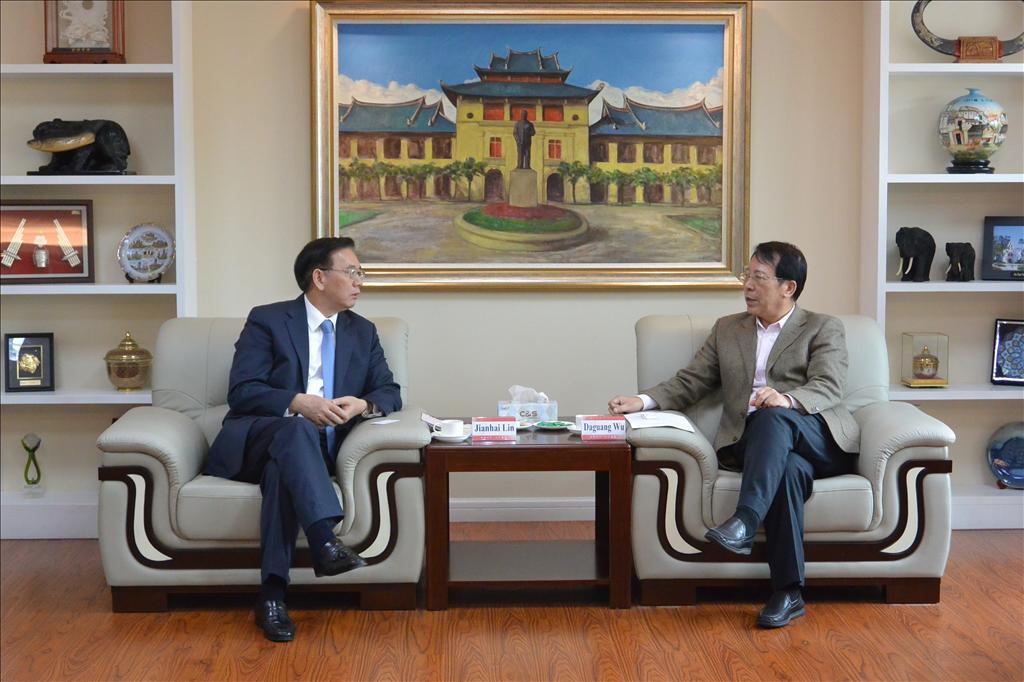 当天上午,厦门大学副校长邬大光会见了林建海秘书长,对他的到来表示欢迎,并简要介绍了厦门大学的办学历史,以及目前“双一流”建设情况。林建海表示,厦门大学的办学历史与校园文化给他留下了深刻的印象,希望以后能有更多的机会来到厦门大学。林建海还介绍了IMF当中中国代表的组成情况,期待有更多来自中国的青年学子加入IMF,提高中国在国际组织中的影响力。邬大光表示赞同,他表示“双一流”计划中一个很重要的标准就是一流的人才能够到一流的机构工作,厦大将继续努力培养、倾力支持一批优秀学生到国际组织实习、工作,推进“双一流”建设。温州市政协港澳台侨与外事委主任、温州公共外交协会副会长兼秘书长潘一新,厦门市温州商会执行会长、厦门日华集团董事长南存钿,以及我校国际处副处长余宏波、学生处就业指导科科长杨明伟、经济学院与王亚南经济研究院教授陈国进等陪同会见。