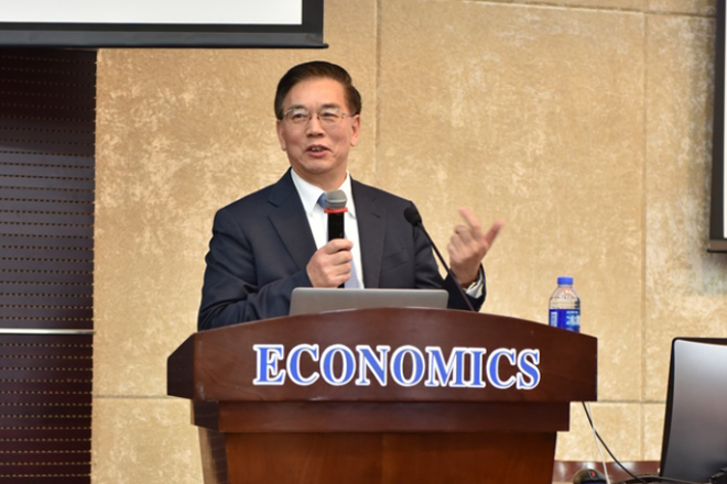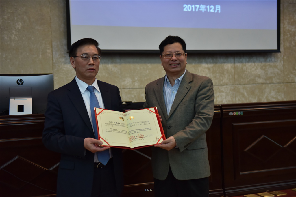 讲座由厦门大学特聘教授、经济学院副院长朱孟楠主持,美国康奈尔大学教授洪永淼为林建海秘书长颁授南强学术讲座纪念牌、以及厦门大学经济学院与王亚南经济研究院兼职教授荣誉证书、富邦金融与产业论坛讲座纪念牌。