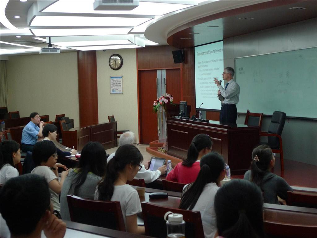 Leeds教授主要从事体育经济的研究,本次报告独特的研究角度引起了在场学生浓厚的兴趣,大家踊跃提问,Leeds教授一一作答,现场气氛十分活跃。报告结束后,方颖和经济学院国际教育合作中心主任Chris White等热情接待了来宾,双方都对未来的合作充满希望。天普大学和厦门大学从2008年合作至今,一直关系良好。厦门大学每年选派15名优秀学生前往天普大学交流,这些学生的优异表现也给天普大学的教授们留下了深刻的印象。