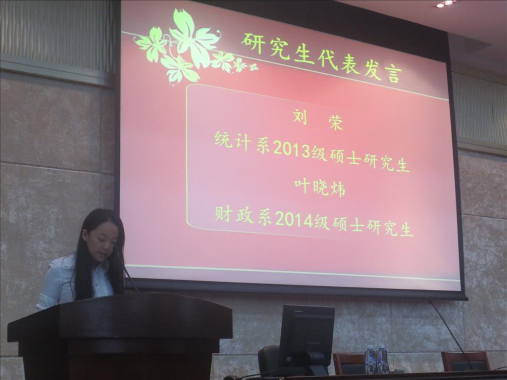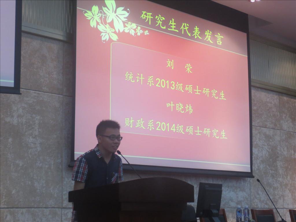 研究生老生代表、统计系2013级硕士生刘荣,新生代表、财政系2014级硕士生叶晓炜分别发言。刘荣讲到,厦大拥有全国最美丽的校园,优秀亲和的老师,希望学弟学妹们能够好好利用学校的资源,度过一个充实无悔的研究生生活。叶晓炜刚刚完成了宁夏支教任务,回到校园的研一新生,他慷慨激昂地告诉大家他选择读研选择厦门大学的理由,并表达了“雄关漫道真如铁,而今迈步从头越”的信心,相信自己能够在研究生生活中收获更多,成长更快。