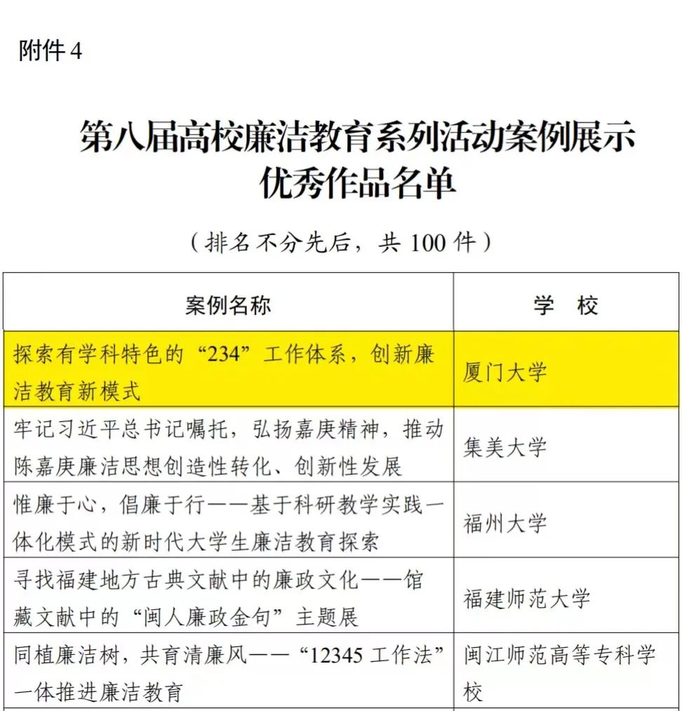 2022年11月,教育部以“廉洁润初心 铸魂担使命”为主题,启动第八届高校廉洁教育系列活动,围绕推动党员领导干部廉洁从政、教师廉洁育人、学生廉洁养成精心组织,分知识问答、作品征集和案例展示三个单元。在案例展示单元,全国共有100个案例作品入选。公布作品将在新华网、全国高校思想政治工作网、中国大学生在线、中国教育发布、国家智慧教育公共服务平台学习二十大云课堂进行展播。
