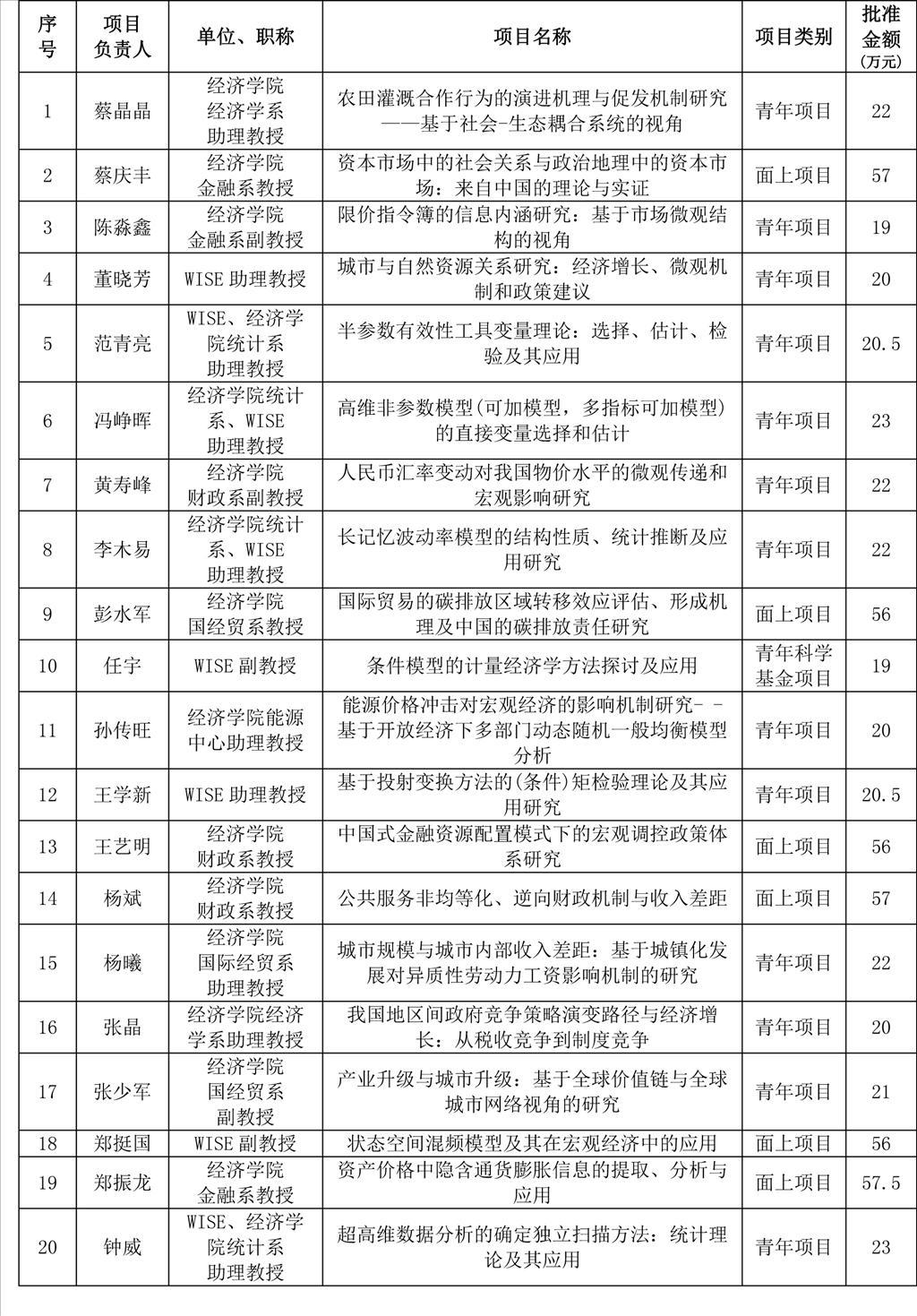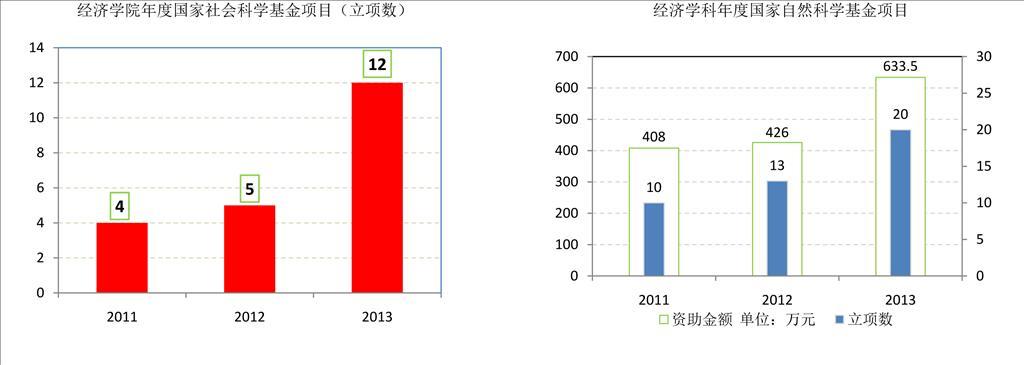 继前不久经济学院年度国家社科项目立项创新高后,近日,国家自然科学基金委员会又传喜讯,在“关于公布2013年度国家自然科学基金申请项目评审结果的通告”中,经济学科项目竞争实力强劲,截至8月16日,立项数、批准金额又创历史新高,立项数首次获批20项,资助总额达到633.5万元、也是首次突破600万元。其中蔡庆丰、彭水军、王艺明、杨斌、郑挺国、郑振龙6位教师获面上项目的资助,比去年增加1位获资助;蔡晶晶、陈淼鑫、董晓芳、范青亮、冯峥晖、黄寿峰、李木易、任宇、孙传旺、王学新、杨曦、张晶、张少军、钟威14位教师获青年科学基金项目资助,比去年增加6位获资助。