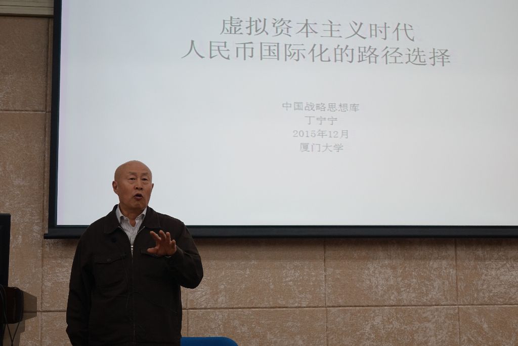 丁宁宁博士为国务院发展研究中心社会发展研究部前部长,国务院发展研究中心学术委员会委员,经济学博士、研究员,中国能源研究会理事,中国发展研究基金会理事。他研究领域主要为技术经济、发展战略、宏观经济、体制改革、社会政策等。 丁宁宁博士在经济社会政策领域有着非常丰富且深入的研究。适逢2015年12月1日,国际货币基金组织正式宣布人民币将于2016年10月1日加入SDR(特别提款权)之际,丁宁宁博士的讲座吸引了许多老师同学们前来聆听学习。