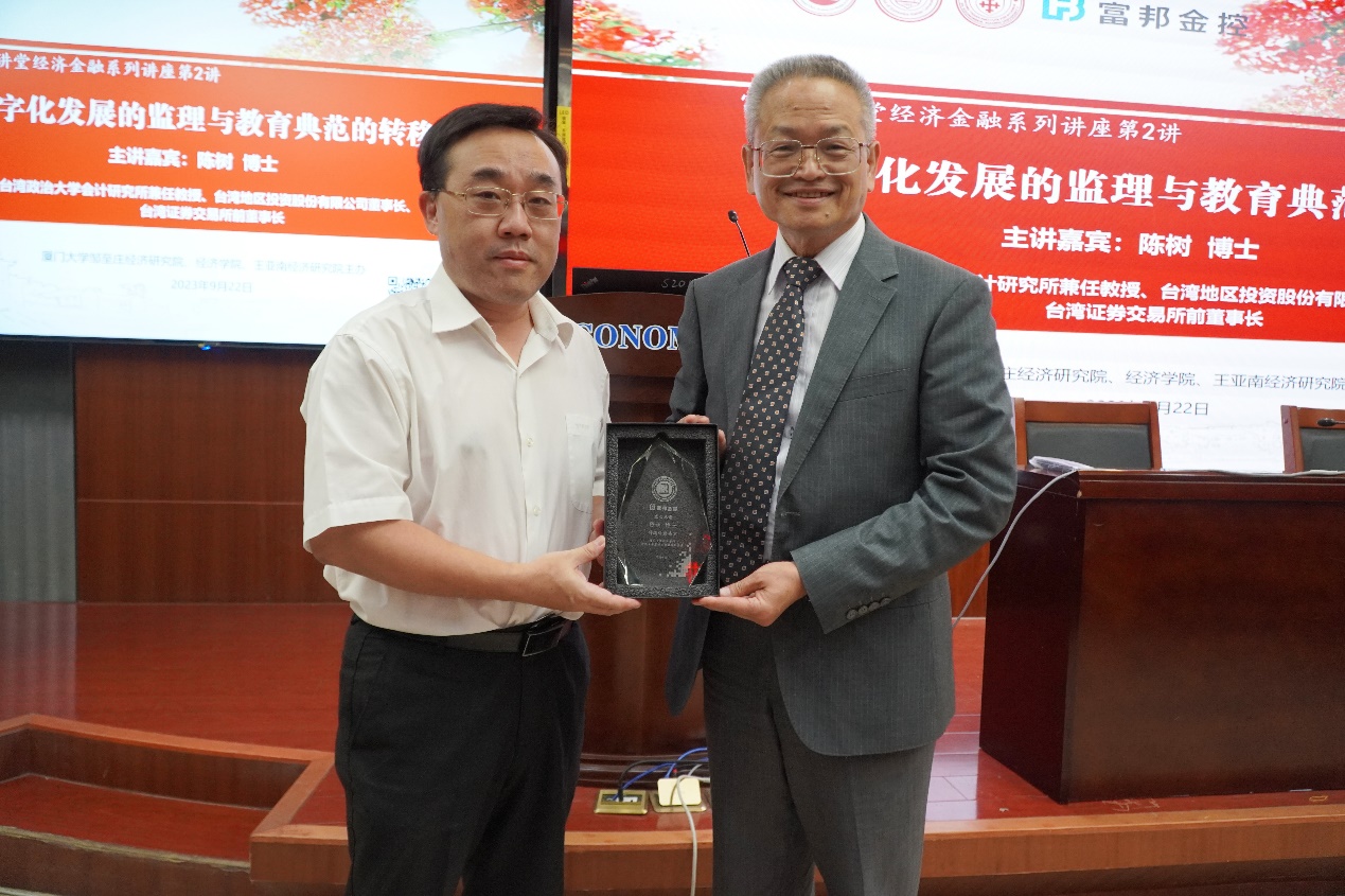讲座由厦门大学邹至庄经济研究院、经济学院、王亚南经济研究院联合主办,厦门大学富邦两岸金融与产业研究中心承办,由经济学院金融系副教授黄娟娟主持。讲座开始前,经济学院、王亚南经济研究院院长周颖刚教授为陈树博士颁授讲座纪念牌。
