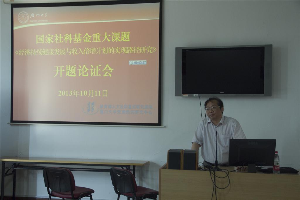 10月11日上午,教育部人文社会科学重点研究基地——厦门大学宏观经济研究中心在经济楼D310室举行了国家社会科学基金重大项目《经济持续健康发展与收入倍增计划的实现路径研究(13ZD&029)》开题论证会。宏观经济研究中心、经济学院近百名师生出席了论证会。项目首席专家、中心副主任龚敏教授首先介绍了课题设计的研究思路;其次,由中心博士后谢攀博士汇报了课题研究的前期准备情况和迄今的进展;之后,子课题负责人靳涛教授、卢盛荣副教授、陈贵富副教授分别报告了子课题研究的具体思路及进展;最后,厦门大学社科处处长陈武元教授围绕课题展开以及课题经费管理等提出了相关指导建议。