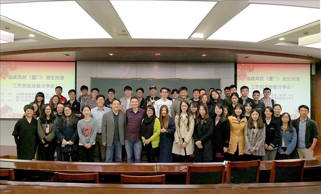 11月25日,由中国教育留学交流(香港)中心和厦门大学学生就业创业指导中心主办、厦门大学经济学院承办的福建高校(厦门)港生回港工作创业经验分享会在厦大经济楼N303举办。中国教育留学交流(香港)中心主任巩万、厦门大学经济学院党委副书记王艺宏、厦门大学学生就业创业指导中心任艳青老师等参加了分享会。来自厦大经济学院、王亚南经济研究院(WISE)的近70名港生到场聆听。