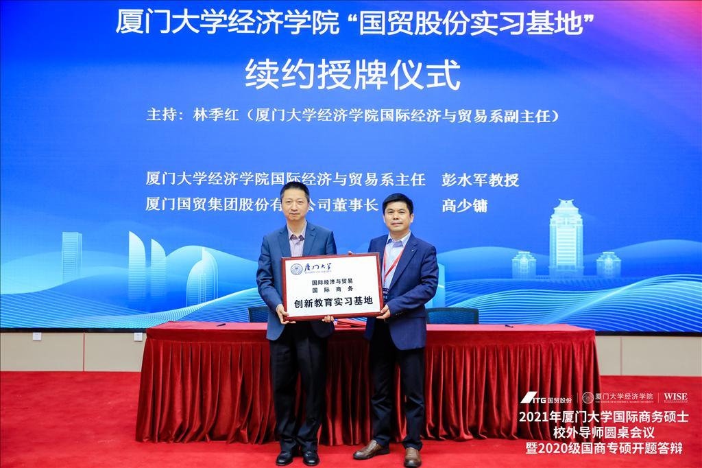 在随后的厦门大学经济学院“国贸股份实习基地”续约授牌仪式中,厦门国贸集团股份有限公司董事长高少镛、经济学院国际经济与贸易系主任彭水军代表双方单位进行签约并授牌。