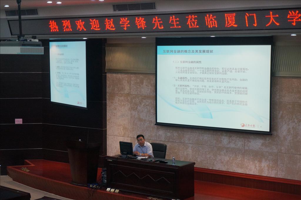 7月13日至14日,《金融时报》党委委员、副总编辑,厦门大学校友、经济学院兼职教授赵学锋在经济楼N402先后作了题为《利率市场化改革与银行“暴利”》和《互联网金融的发展与监管》的2场讲座,富有启发性的讲座使在座同学都受益匪浅。
