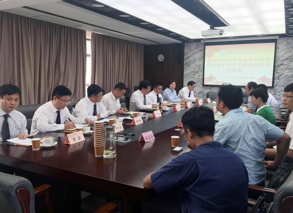 10月23日下午,河北省联社保定办事处党委书记、主任孙双伦,纪委书记、总稽核王金浩一行到访经济学院。经济学院张琥、郭晔、王艺明等老师参加了会谈。