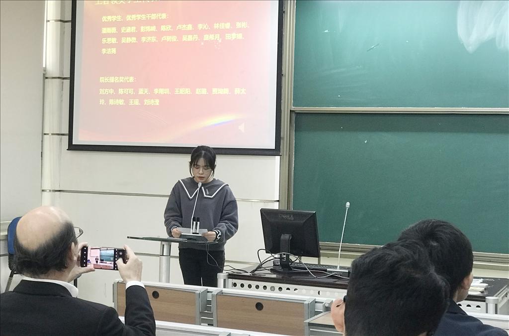 一等奖奖学金获得者吴静微(2019级,主修学院为公共事务学院)作为获奖学生代表上台发言。吴静微同学提到,感谢经济学院辅修项目提供的平台,使她在感到空虚和迷茫之际,有了充实自己学习生活的新方向,过分安逸于当前的生活如同温水煮青蛙,会使人丧失前进的动力。当代大学生需要始终昂扬精神,为实现目标而不懈奋斗。荣誉既是终点,又是起点。她提议获奖同学都应将这份荣誉化作前进的不竭动力,不断追求梦想,不断超越自我。
