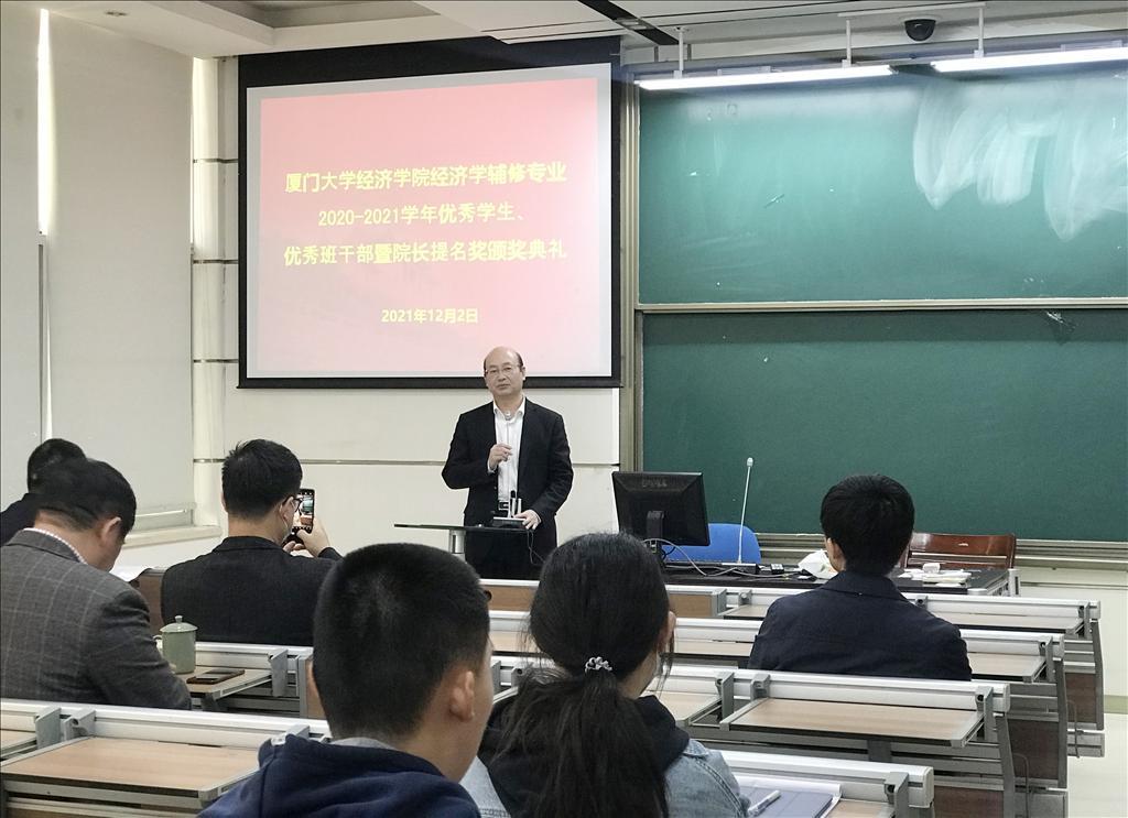 经济学院副院长朱孟楠老师为本次颁奖仪式作表彰致辞,代表学院对获奖同学们表示祝贺。他提到,厦大经济学院辅修项目经过十年来的办学,已树立品牌形象,并有很好的学术声誉。当前的教育趋势表现为宽口径、复合型,厦大经济学院设置辅修的目的也在于顺应这一趋势,培养复合型人才,以此为目标,辅修教育在教学管理、课程学习、培养环节等方面都严格要求执行相关规定和制度。朱老师也希望同学们抓住宝贵的学习机会,利用经济学院和王亚南经济研究院的学术资源充实自己,在努力学习之余认识更多跨学院的各专业朋友,构建多元知识体系,培养核心竞争力,用自己青春的热情和汗水谱写精彩的人生乐章。
