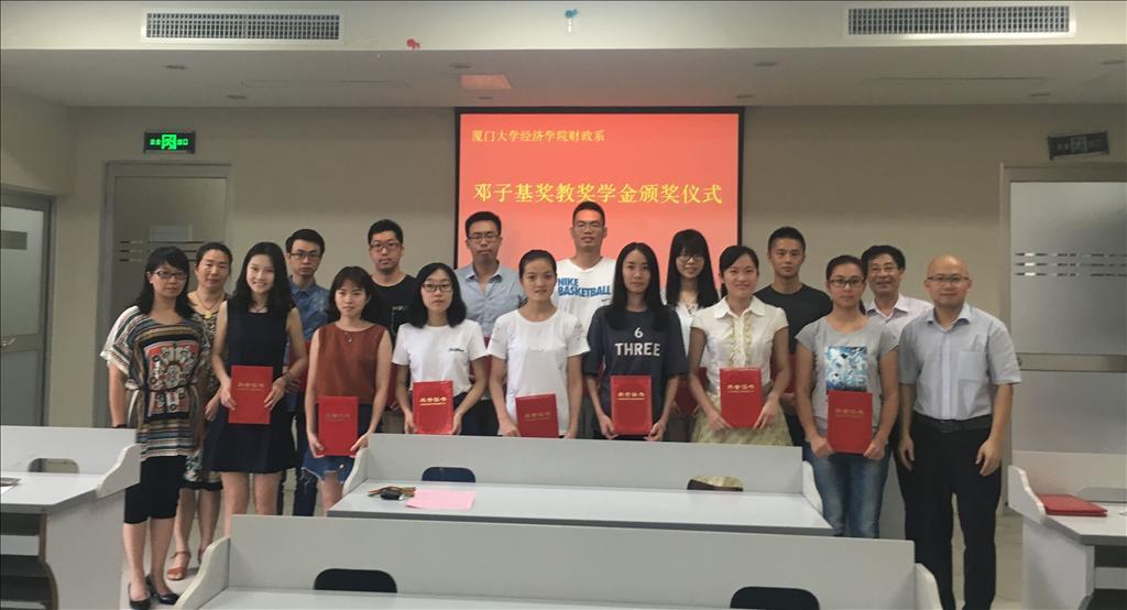 6月17日下午,2016年度邓子基奖教奖学金颁奖仪式在经济楼顺利举行。经济学院党委副书记王艺宏老师、经济学院团委副书记魏艳老师、财政系教工党支部书记朱国清副教授以及财政系获奖师生、学生代表出席了颁奖仪式。
