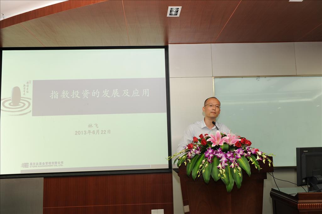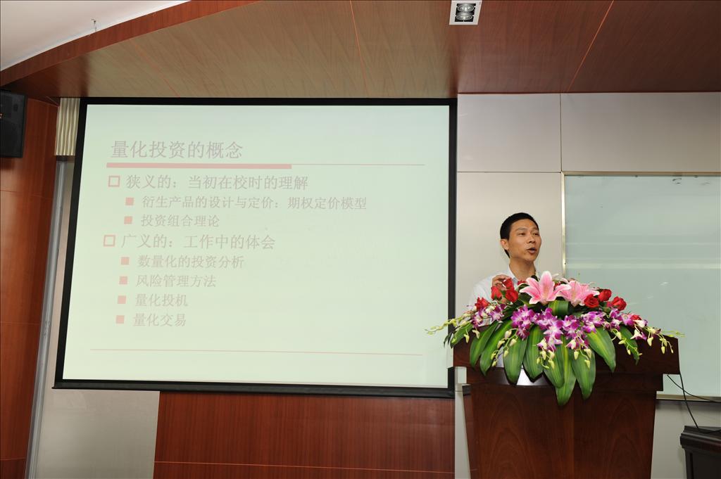 接下来的议程里,黄良文先生的三位弟子——中再资产管理有限公司副总经理陆金海博士、易方达基金管理有限公司指数与量化投资部总经理林飞博士,以及国泰君安资产管理有限公司投资主办人章飚博士,分别上台作了题为“数量化投资理论与实践”、“指数投资的发展及应用”、“套利交易基础与实例”的精彩演讲。他们的演讲风格各异,或鞭辟入里,或翔实缜密,或生动具体,但均凝聚了自己多年从业心得,以扎实的理论功底、深刻的专业见解、丰富的运作经验深深折服了在场的广大师生。而现场互动环节更是将整个讲坛推向高潮,不时激起阵阵热烈的掌声。