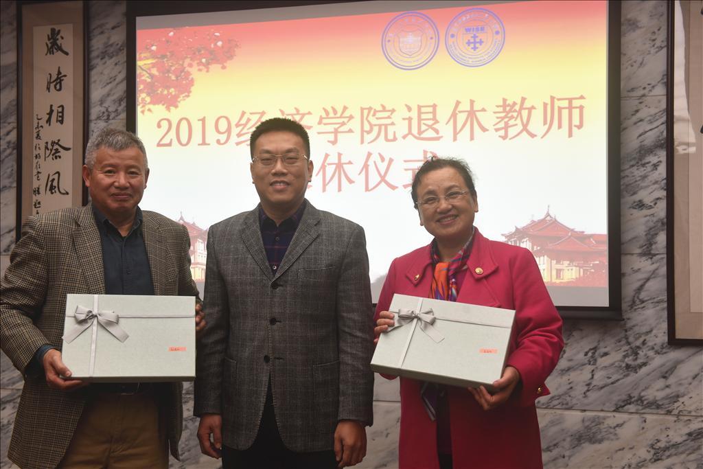 荣休仪式伊始,黄鸿德书记首先发表致辞,对光荣退休的各位老师多年来在教学岗位上兢兢业业,教书育人,为经济学科的发展所做的贡献表示衷心的感谢,并代表经济学院向两位老师敬献鲜花。