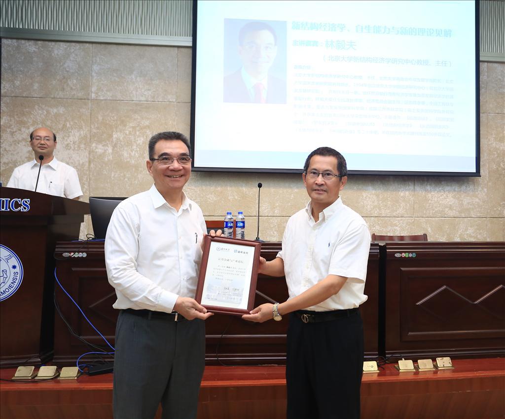 讲座由经济学院副院长朱孟楠教授主持。经济学院党委书记雷根强教授为林毅夫教授颁授厦门大学富邦金融与产业论坛纪念牌。