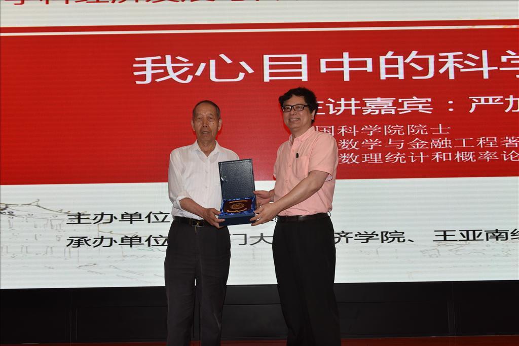 5月21日下午,中国科学院院士、国际数理统计学会会士严加安教授应邀作客厦门大学经济学科,作“我心目中的科学与艺术”为题的讲座。本次讲座在经济学院N402举行,由王亚南经济研究院副院长王艺明教授主持,400余名师生聆听了报告。讲座前,洪永淼教授为严加安教授颁发了南强学术讲座纪念牌。