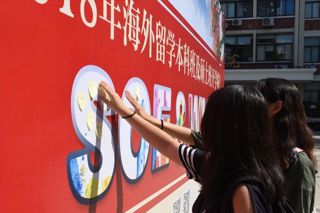 迎新墙前同学们许下心愿,形成一道靓丽的风景线