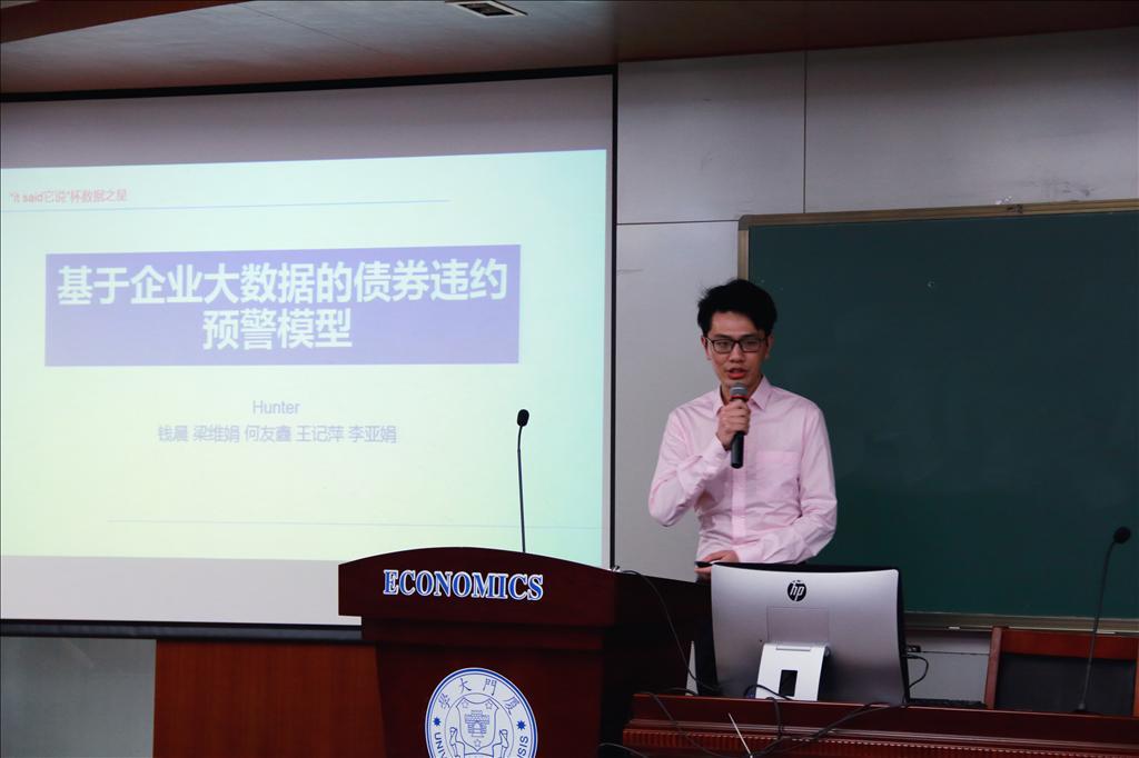 4月27日晚,厦门大学“it-SaiD它说”杯数据之星大赛第一阶段决赛暨颁奖仪式在经济楼N303举行。深圳前海鹏元数据科技有限公司的张智英、王玮俊、林国光,以及计量经济学教育部重点实验室(厦门大学)的陈海强、罗智超、刘必清等老师应邀担任评委。