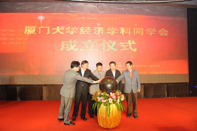 最后,韩景义、王豪杰、潘世墨、洪永淼、罗兴平一起开启了“厦大经济学科同学会”启动仪式的水晶球,共同见证了同学会的正式成立。