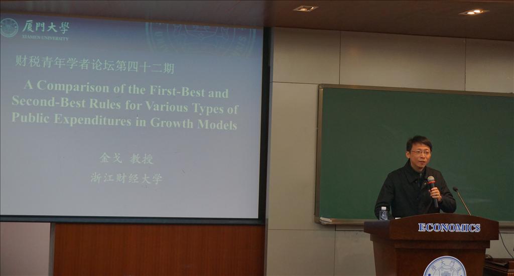 3月28日下午,由厦门大学经济学院财政系主办的“财税青年学者论坛第四十二期”学术讲座在经济N302顺利举行。浙江财经大学财政系金戈教授应邀做了题为“A Comparison of the First-Best and Second-Best Rules for Various Types of Public Expenditures in Growth Models”的精彩讲座。讲座由谢贞发老师主持,经济学院众多老师和同学参加了讲座。