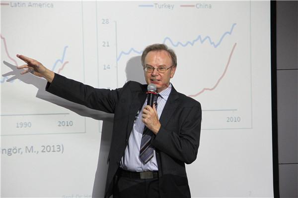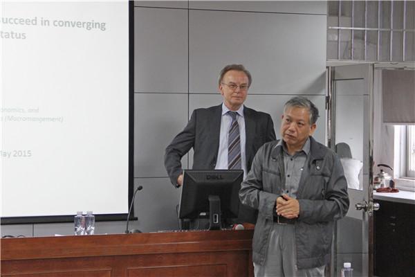在题为“Structural Change and Mid-Income Trap——Under which conditions can/will China succeed in converging toward higher income status”的系列讲座中,Wagner教授指出,通过人为地延迟“去工业化”进程,中国已经在一段时间内赢得了额外的增长;尽管相似的策略也曾被德国采用并最终成功跨越中等收入陷阱,但是这一做法仍存隐患。随后针对中国经济的模拟预测指出,第三产业的生产效率对中国未来的增长至关重要。此后,Wagner教授针对中国未来可能开展的制度改革及相应的研究空间作了展望。在题为“Will the Eurozone Survive? ——The Challenge of Regional Divergence”的演讲时,Wagner教授表示加入欧元区的意愿能够激励一些国家进行体制改革,因此欧洲一体化进程对区域内的制度改革和经济趋同确实有正面作用;但是一旦“提前”令一个国家进入欧元区,相关改革往往陷于“失速”,经济分化故态复萌。在以“Which are the adequate answers to house/asset price booms?——Lessons from other countries”为题的报告中,Wagner教授对近来中国经济的热点问题——房地产和资产泡沫进行了深入探讨。Wagner教授将泡沫周期中各种不同政策配合的讨论应用到中国的政策实践中,发现中国政府当前面对泡沫采取的各项政策之中存在矛盾和抵触,然而要解决这一问题,又会引出政策配合度优先或央行独立性优先等一系列复杂命题。