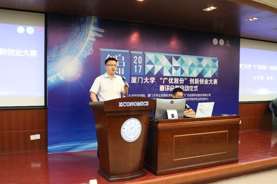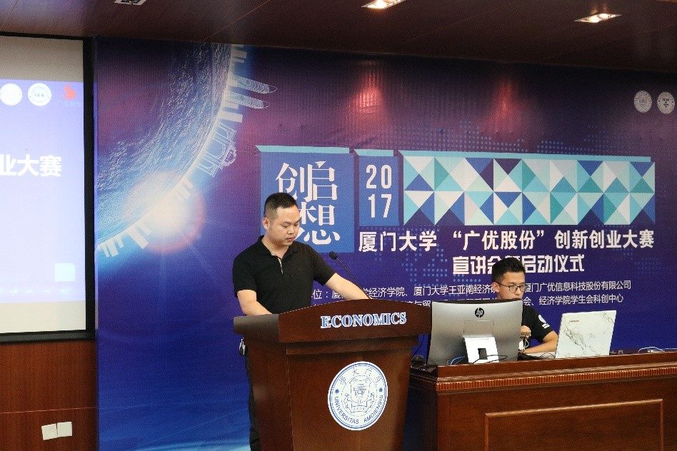 2017年5月26日晚,厦门大学“广优股份”创新创业大赛宣讲会暨启动仪式在经济楼N302成功举行。大赛邀请了厦门广优信息科技股份有限公司总经理叶祯富、战略总监林声纲,王亚南经济研究院副院长王艺明教授,经济学院国际经济与贸易系主任彭水军教授和经济学院金融系蔡伟毅老师莅临指导。