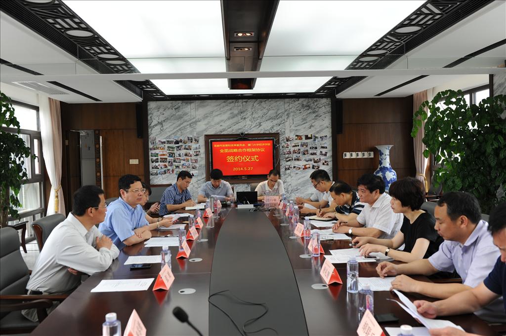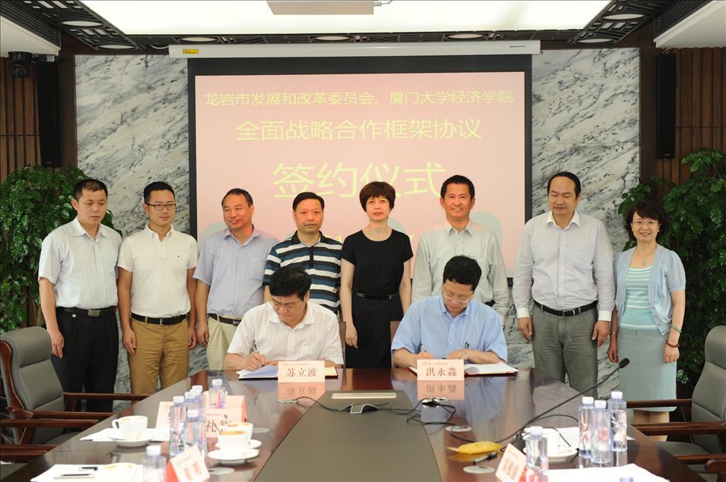 5月27日上午,厦门大学经济学院与龙岩市发展和改革委员会在经济楼N501室签署全面战略合作框架协议。厦门大学经济学院、王亚南经济研究院洪永淼教授与龙岩市发展和改革委员会党组副书记、副主任、调研员(主持工作)苏立波代表双方签订协议。