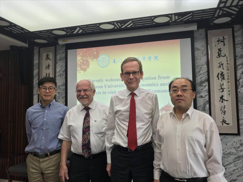 周颖刚教授和韩乾副教授代表两院对来宾的到来表示热烈的欢迎,并为来宾介绍了厦大经济学科,学科国际交流与合作方面的建树。朱可夫斯基校长随后对波兹南经济大学进行了整体介绍,波兹南经济大学除了教研实力雄厚,还强调国际交流,已经与中国的暨南大学、南京大学等校建立合作,此次来访希望与厦大经济学科开展学生和学者交流活动。双方就可能合作的方式进行了探讨。