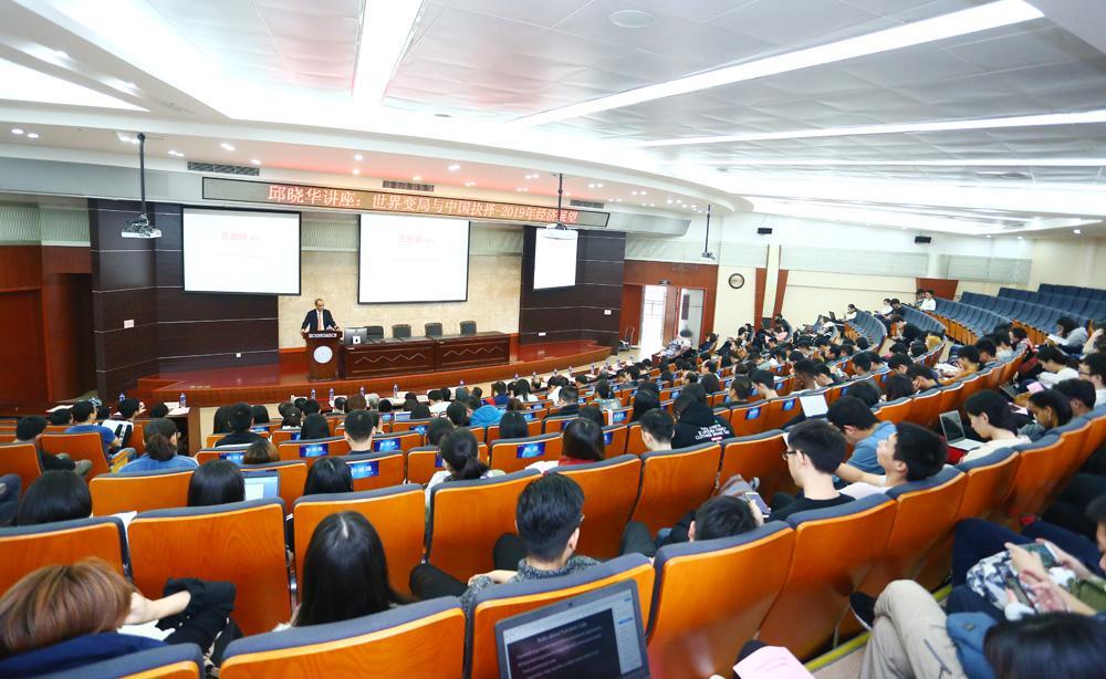 颁奖典礼后,原国家统计局总经济师、新闻发言人、国家统计局局长,现任阳光保险资管首席战略官、华兴银行首席经济学家邱晓华博士为与会师生做了题为“世界变局与中国抉择—2019年经济展望”的主题演讲。