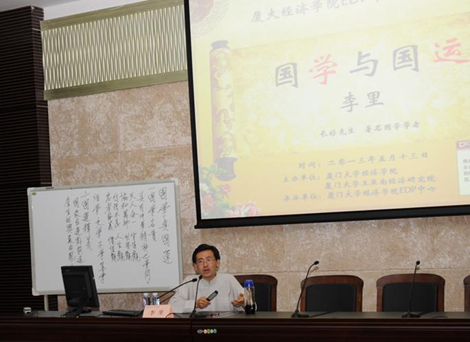 5月13日下午,著名国学学者李里应邀做客厦大经济学院EDP中心国学大讲坛,给学院师生及经济学院EDP中心的学员带来了题为《国学与国运》的讲座。经济学院院长助理罗智超主持讲座。