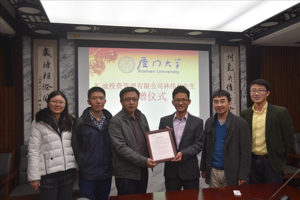 陈海强教授在致辞时代表厦门大学经济学科对林伟林先生和汇迪投资管理有限公司致以深深的谢意,并高度赞扬了汇迪投资管理有限公司以及林伟林先生在企业成功之时,积极履行社会责任,捐资兴学支持教育的情怀。