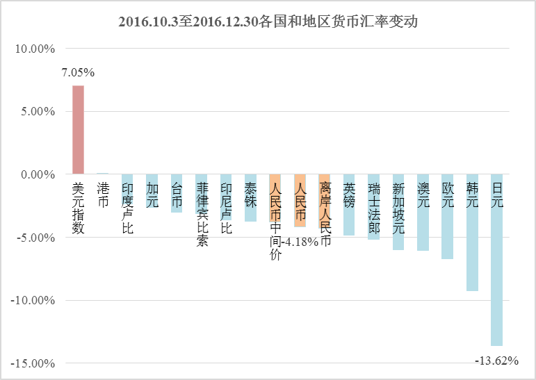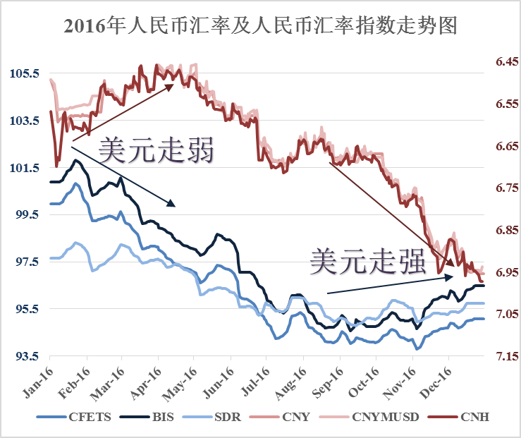 12月15日美联储加息25个基点,美国联邦基金利率从0.25%-0.5%上升至0.5%-0.75%。在岸人民币应声跌破6.94关口,刷新八年半低位。回顾2016年,“贬值”是人民币汇率的主基调。2016年1月1日至2016年12月30日,美元指数由98.63上涨至102.68,上涨4.5%,人民币兑美元汇率中间价由6.4936下降至6.9370,贬值约6.6%。同期,人民币兑CFETS、BIS与SDR货币篮的汇率指数各自贬值了4.2%、4.1%与1.9%(图1)。
