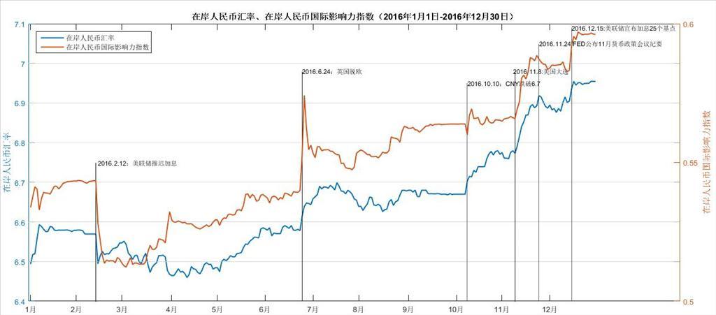 面对人民币国际使用下降的态势,人民币汇率国际影响力逆势走强!在2016年6月24日英国脱欧当天、2016年11月美国大选之后,2016年12月15日美联储加息当天,随着人民币汇率急剧下跌,人民币影响力指数却显著上升(图3)。