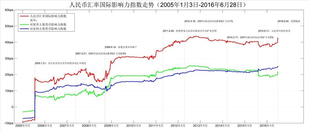 应该指出的是,现有的人民币国际化指数通常以人民币在国际贸易结算、投资、储备的数额及在国际货币中排名作为标准来衡量其重要性,却忽略人民币汇率对其他货币的影响程度及其走势。而厦门大学人民币汇率国际影响力指数让汇率市场数据说话,能够及时地跟踪人民币汇率的变化对世界和亚洲主要货币汇率的影响,不仅很好地展示了人民币国际化进程中历次汇制改革实施后人民币国际影响力的变动,还可以用来分析重大国际国内经济事件发生后人民币国际影响力的变动。