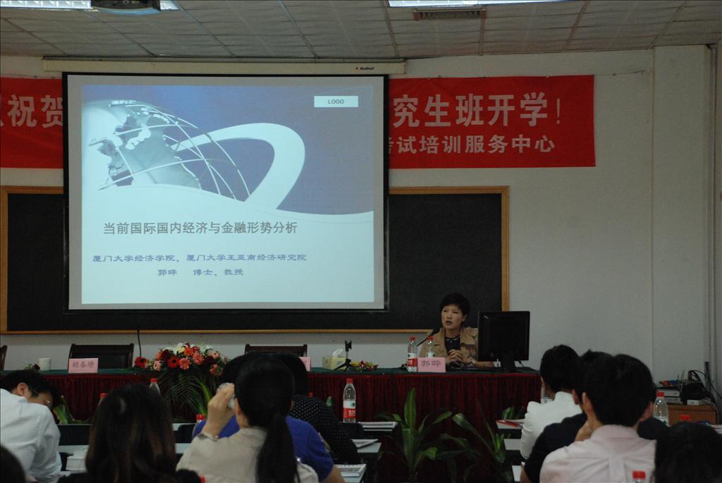 之后,郭晔教授以“当前国际国内经济金融形势分析”为题,为大家带来精彩演讲。她就当前国内外经济金融的发展现状进行了简要的回顾与分析,对当下经济热点问题进行了深入剖析,并与大家探讨了未来金融业的发展趋势。学员们纷纷表示受益匪浅,激发了金融学科学习和探讨的热情,为福州研究生课程班的正式开学起了一个良好的开端。