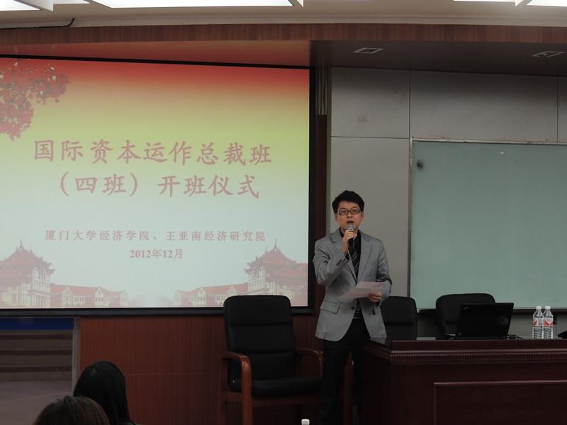 罗智超代表经济学院、王亚南经济研究院在致辞中,对新学员的到来表示欢迎,并介绍了厦大经济学科和经济学院EDP中心的办学特色。他强调,国际资本运作总裁班是经济学院、王亚南经济研究院凭借丰富的海内外业界与学术界的资源网络,针对中国企业家对境内外上市资本运作的需求,整合中、英、美、新加坡、香港等地资本市场高端资源,汇聚国际金融名家及实战专家,精心打造的精品项目。经济学院EDP中心举办的总裁班追求的是班级质量,在核心课程之外,还将通过举办论坛沙龙、展开海外游学、组织企业参访等形式为学员带来增值服务,让学员切实收获课程价值,为推动学员企业发展提供针对性强的智力支持。
