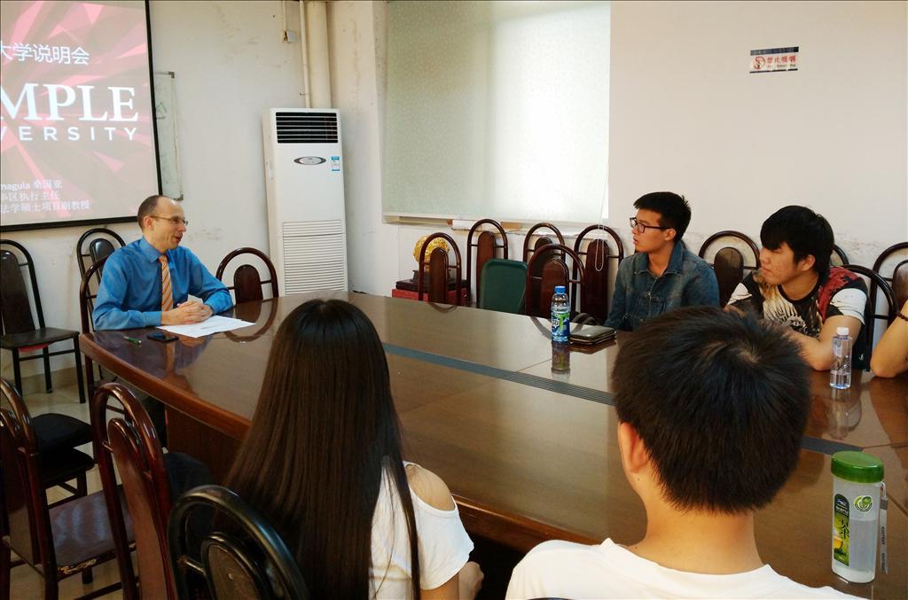 当天下午,John Smagula先生与1+3海外留学本科班天普大学项目的学生举办见面会。Smagula先生详细介绍了天普大学的优势学科、办学特色、地理位置、学生社团活动、住宿等情况,并一一回答了学生们的提问。