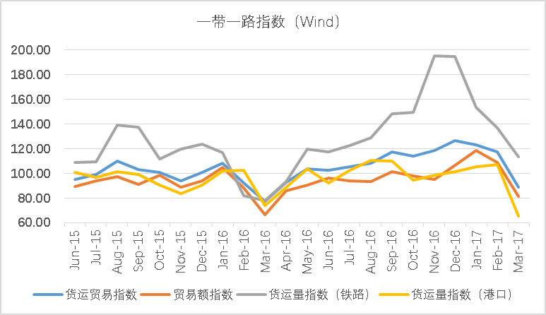 根据国家信息中心、“一带一路”大数据中心等机构共同编写的《“一带一路”贸易合作大数据报告(2017)》显示,2016年中国与沿线国家贸易总额约为9535.9亿美元,占中国对外贸易总额的比重达25.7%。中国向沿线国家出口自2011年以来整体呈现上升态势,2016年向沿线国家出口5874.8亿美元,达到近年来的高位。进入2017年,中国与一带一路沿线国家贸易有所下降,以货运贸易、贸易额、货运量计算的“一带一路”指数应声下跌,见图一。2015年以来,中国对“一带一路”相关国家直接投资持续增长,但在中国对外投资总额中所占比例仍然相对较低。在区位分布方面,中国对“一带一路”直接投资主要集中在东南亚(东盟)、中东(西亚)和南亚地区,中东欧地区吸引中国投资的起点较低,但增长迅速。