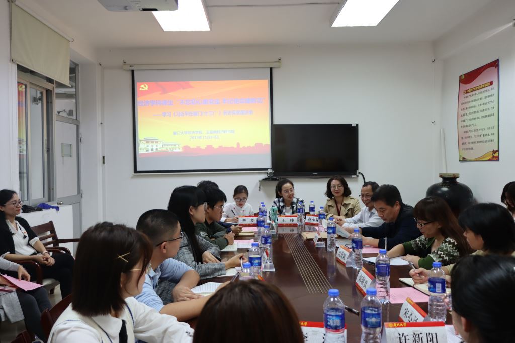 2019年11月13日下午,经济学科师生“不忘初心跟党走、牢记使命建新功——学习《习近平在厦门(十三)》”在经济楼A417会议室顺利举行。经济学院1983级院友张宏樑出席座谈会并分享与习近平同志交往的珍贵往事。院党委书记黄鸿德,院团委书记刘莉颖,副书记郑淑真、陈启妍、赵小姝,全体辅导员和学生代表参加座谈。会议由院团委书记刘莉颖主持。