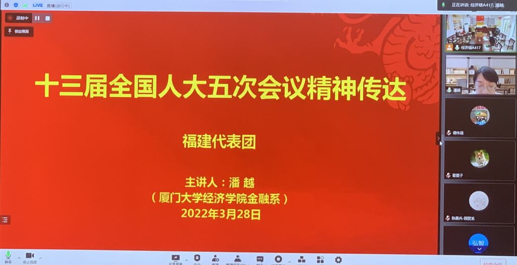 潘越从大会概况、大会主要精神、福建代表团履职情况等方面进行了传达,重点传达了习近平总书记参加内蒙古、解放军和武警部队代表团审议及看望政协农业界社会福利和社会保障界政协委员时的重要讲话精神,并从金融业视角深入解读了2022年《政府工作报告》,带领师生读懂两会新亮点,介绍了计划报告、财政预算报告,全国人大常委会工作报告,最高人民法院、最高人民检察院工作报告中的要点内容,说明了福建省代表团参加审议和提出意见建议情况。