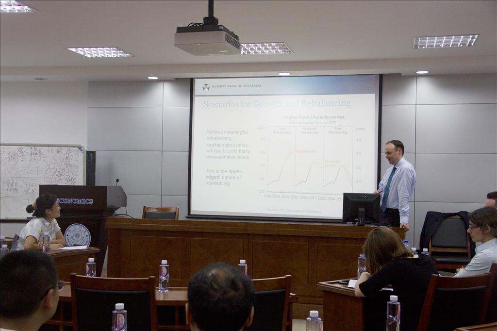 Workshop结束后,Ivan Roberts移步A501会议室,应邀主讲本学年中心系列Seminar Series的第六讲,基于其与合作者最新的研究成果作了题为A Rebalancing Chinese Economy: Challenges and International Implications的报告。通过援引相关研究及数据,Ivan Roberts针对中国宏观经济账户长期失衡的现象及成因进行了分析,更指出当前中国资本回报率的下降和融资成本的上升正引起经济结构的再平衡。基于现阶段再平衡过程更多是由于投资放缓而非消费增加引致的特点,他进一步预测了三种不同情境下这种再平衡的未来发展趋势;尽管未来中国经济将出现哪一种再平衡过程尚不可知,但是更快的再平衡过程更需要高效率投资的增加以及消费的增长而不仅仅是政府的刺激政策。演讲结束后,中心师生踊跃发问,交流氛围热烈。