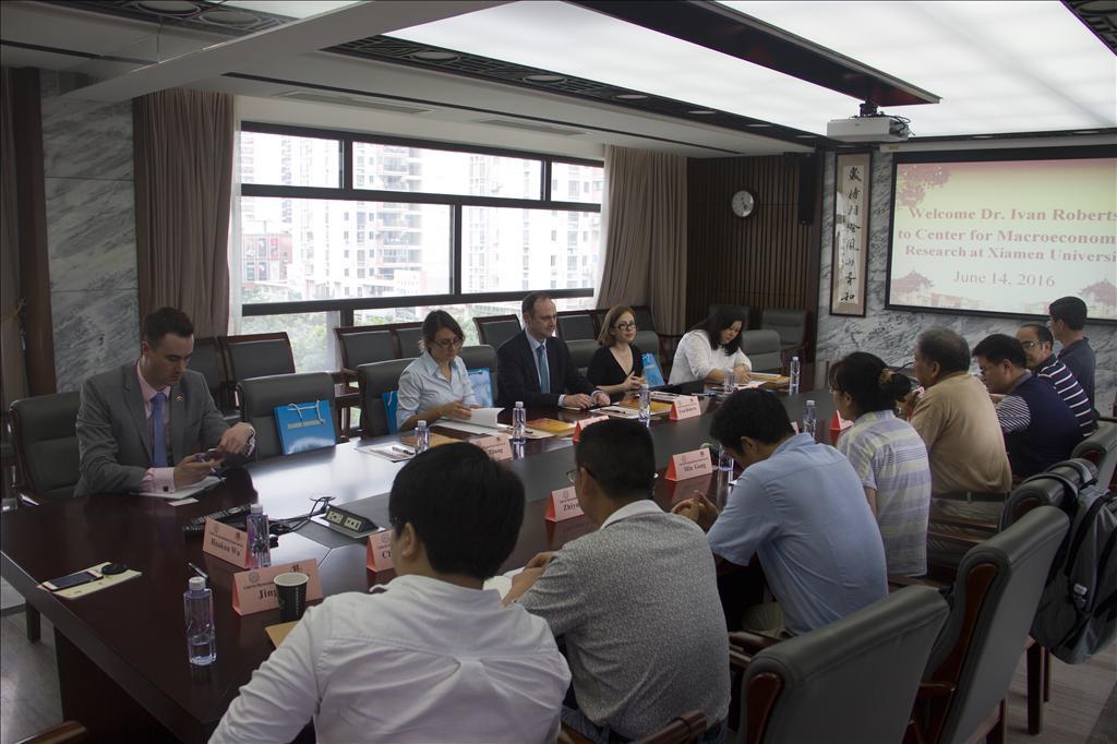 6月14日,澳大利亚储备银行亚洲研究部主任Ivan Roberts、高级经济学家Arianna Cowling一行5人造访教育部人文社会科学重点研究基地――厦门大学宏观经济研究中心(CMR)。除与宏观经济研究中心联合举办小型双边Workshop外,Ivan Roberts还应邀作客宏观经济研究中心Seminar Series以中国经济再平衡为题进行演讲。宏观经济研究中心副主任龚敏教授主持此次学术活动。